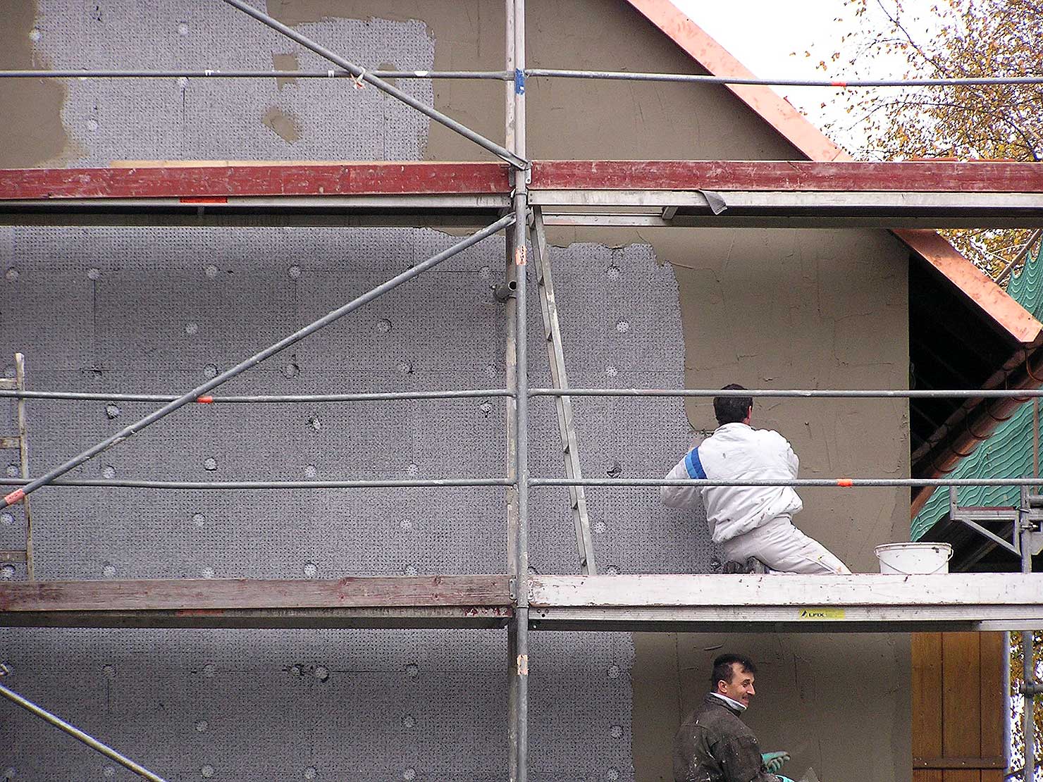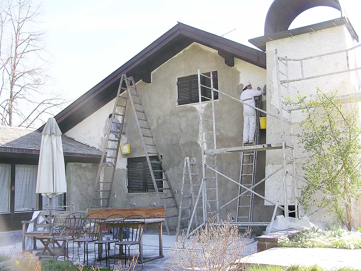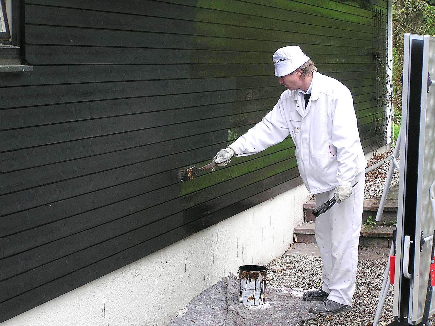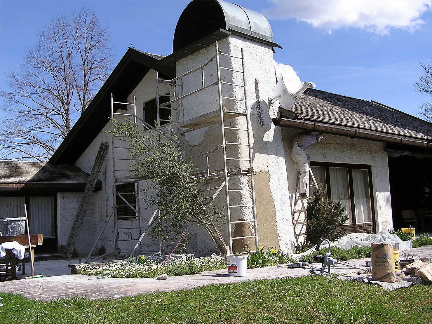 Ab- u. wieder Anbau von Markisen u. Ähnlichem, Gerissener Anstrich, Putzabplatzungen am Kamin, Risse, Säubern der Fassade mit Wasser und Hochdruckreiniger, vollflächige Spachtelung, Kamin mit Gewebearmierung, Kamin neu verputzen, 2-maliger Anstrich mit Mineralfarbe, Renovierungsanstrich bei Holzflächen