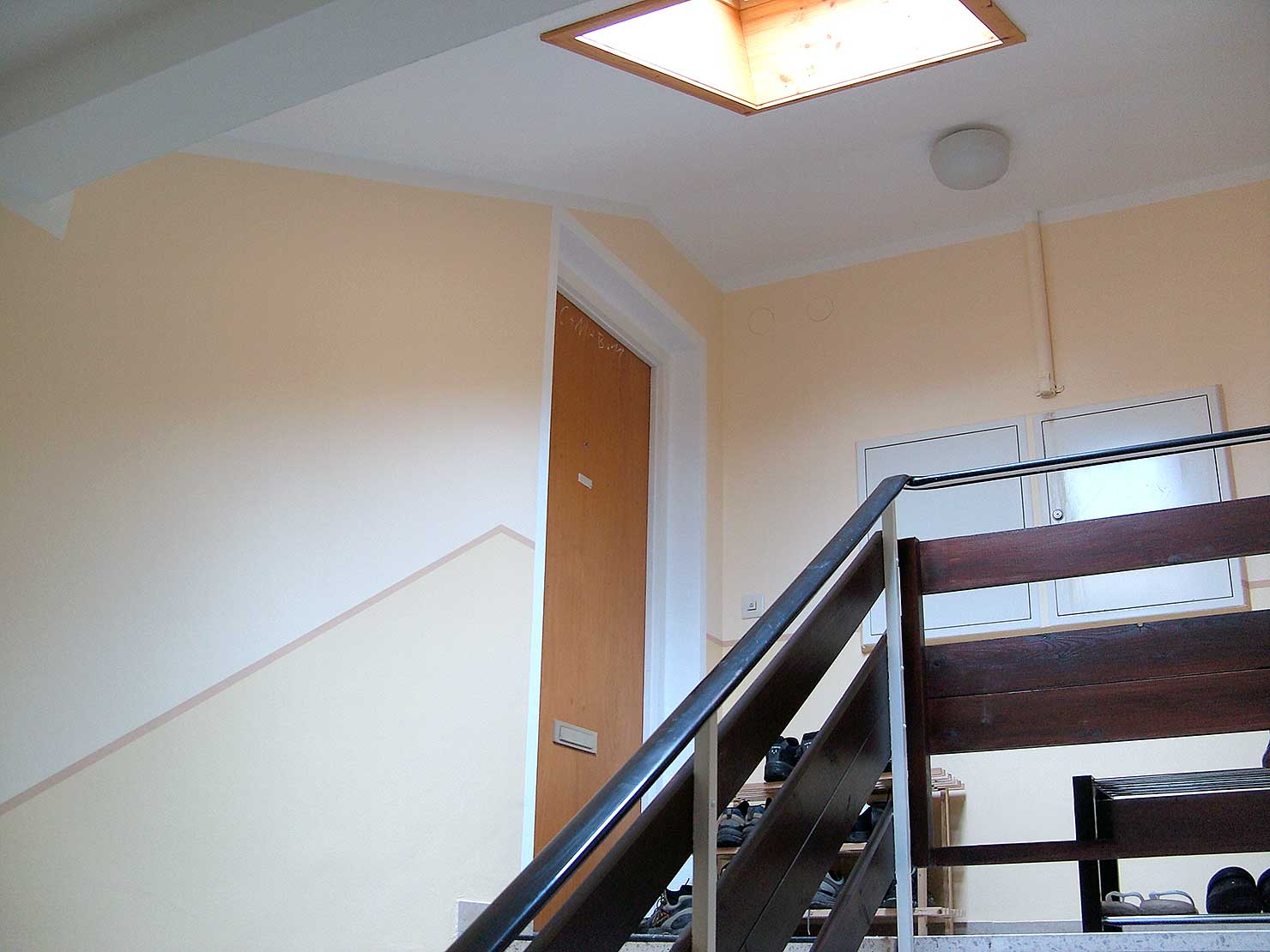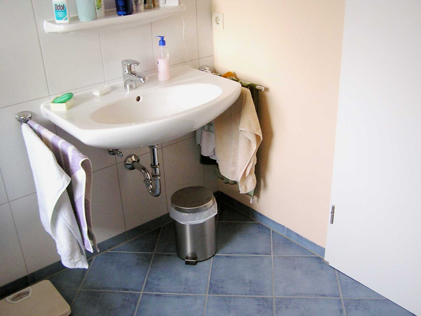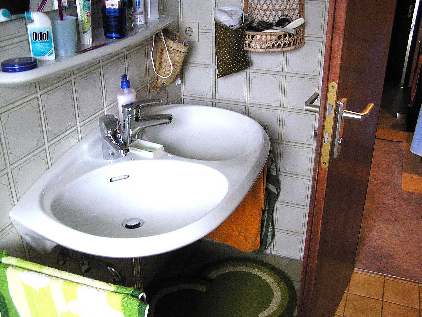 Entfernen der Fliesen und Einrichtungen, neu gefliest, Wände verputzt, Stuckleisten, Decke weiß, Wände leicht Aprico getönt, Tür und Fenster weiß lackiert.