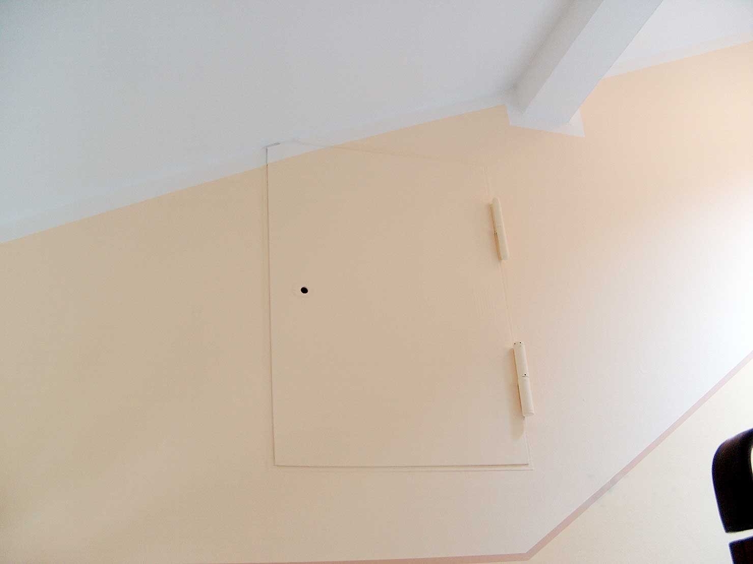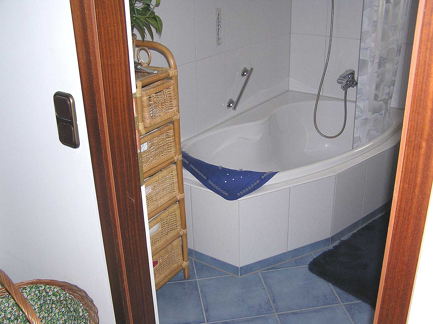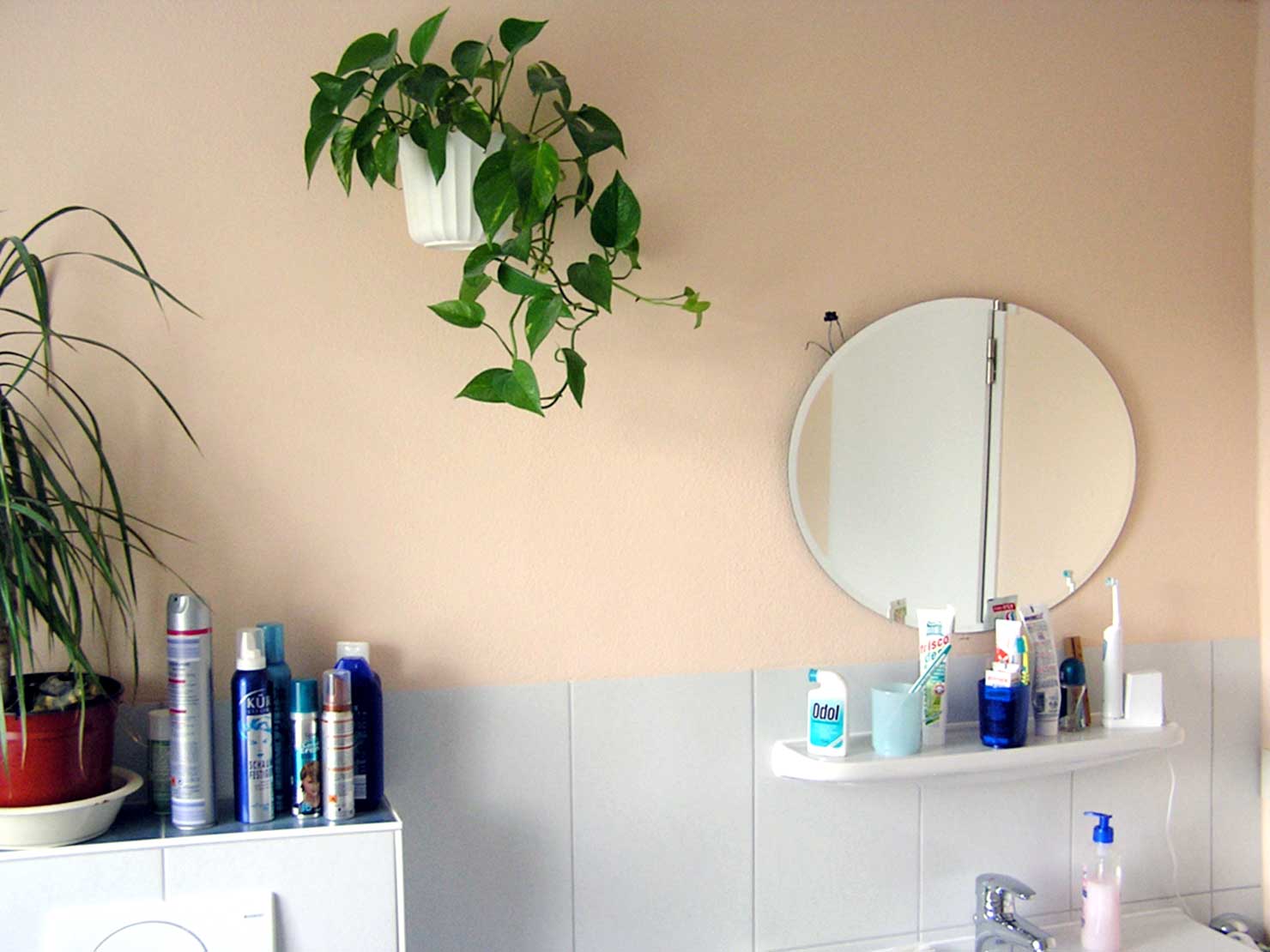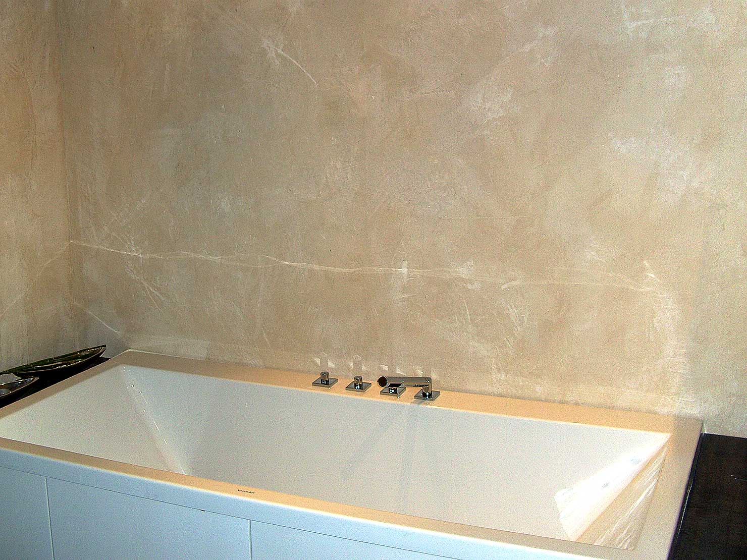 Entfernen der Fliesen und Einrichtungen, neu gefliest, Wände verputzt, Stuckleisten, Decke weiß, Wände leicht Aprico getönt, Tür und Fenster weiß lackiert.