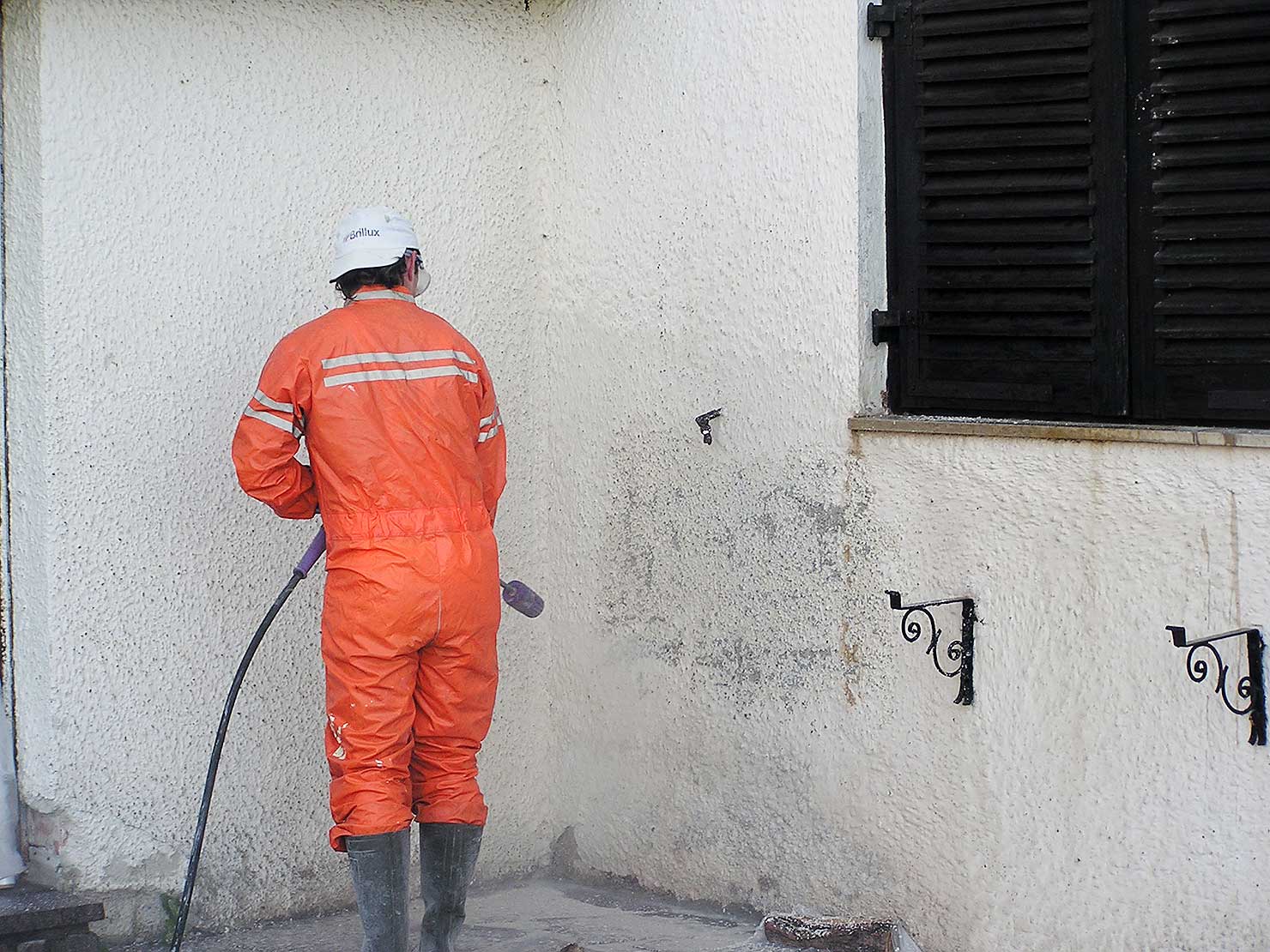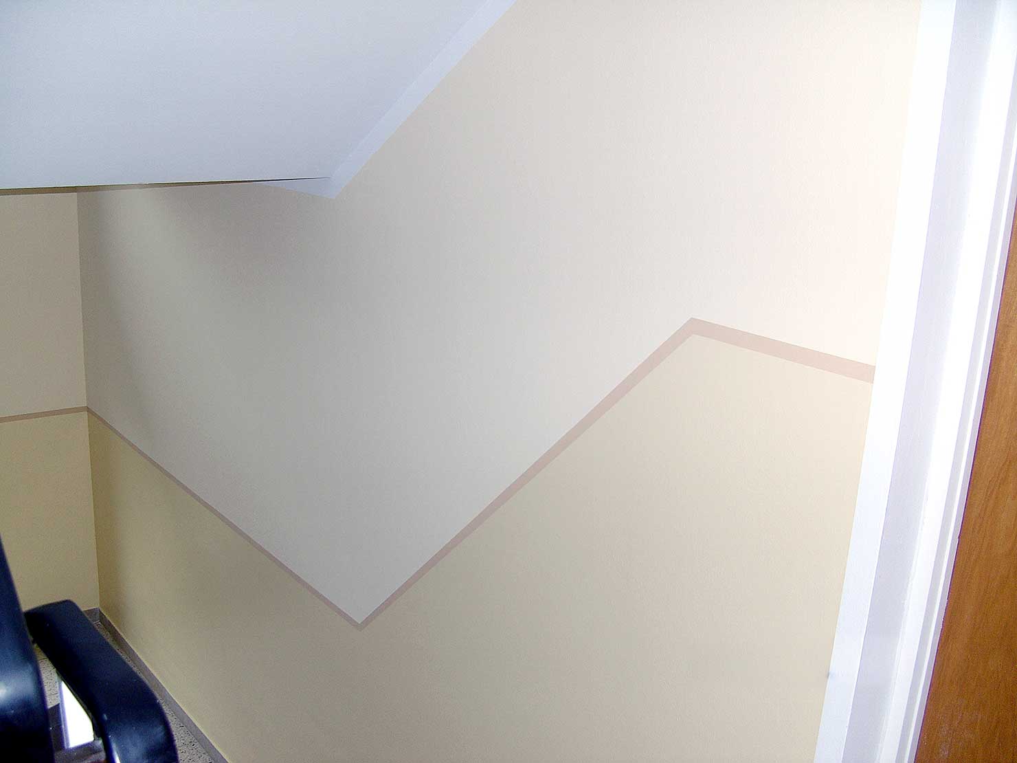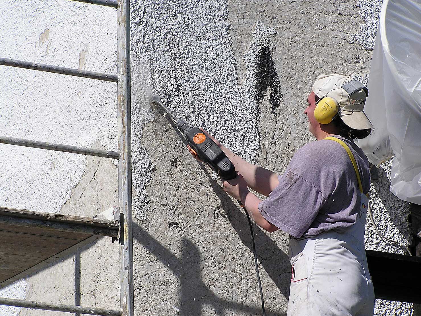 Gerissener Anstrich, Lagerfugen des Mauerwerks sichtbar, Abkratzen des gelockerten Anstrichs und Putzes, vollflächige Gewebearmierung, neu Verputzen, Anstrich leicht getönt
